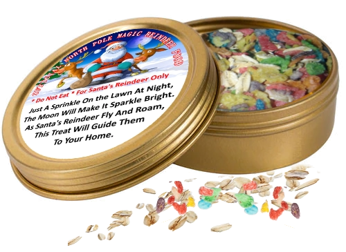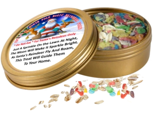 A tin full of fun, filled with magic!As Santa's reindeer fly and roam This treat will guide them to your home. (Product contains Oats, Cereal, & Gliiter)